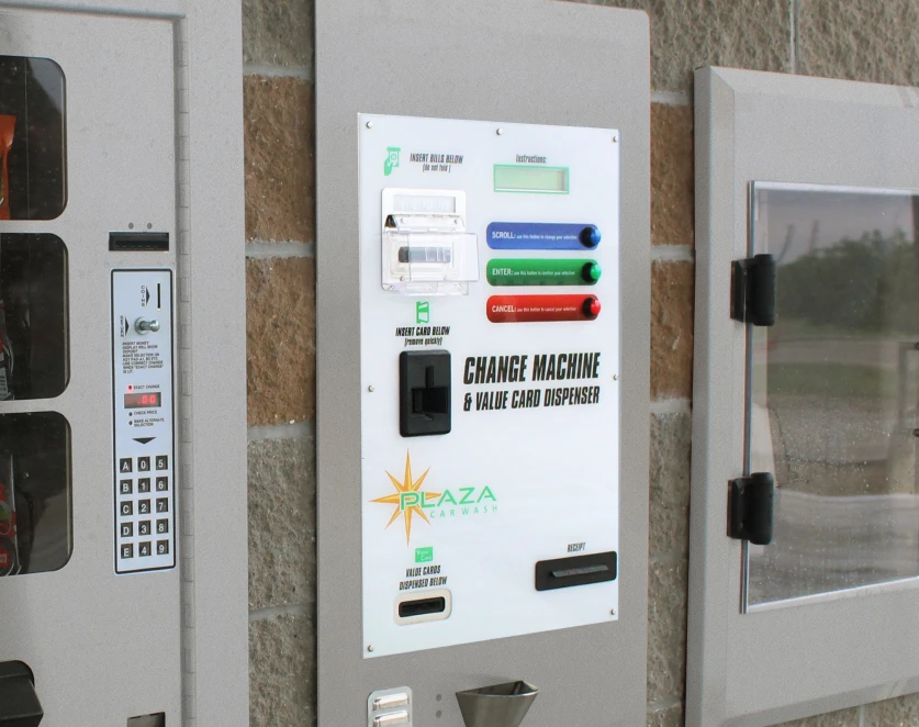 The Card and Change Dispenser (CCD) offers both a gift card dispenser and change machine in one convenient rear-load unit. Customers can purchase new gift cards, check balances on existing cards, and add additional value through a simple instructional display. They can also print receipts at the CCD for transactions made in self-serve bays.
